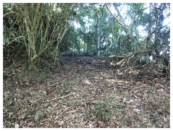 09:49 三叉路口,右前往茅山南峰經出火出南化三界𡊨(ㄊㄢ´)之西側登山口不取,取左直前的土質產道經一座的鐡門緩上到梅園,順路往稜線緩陡上。