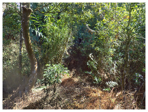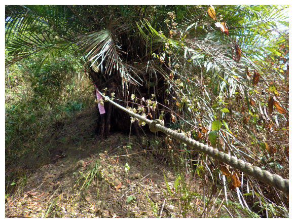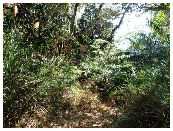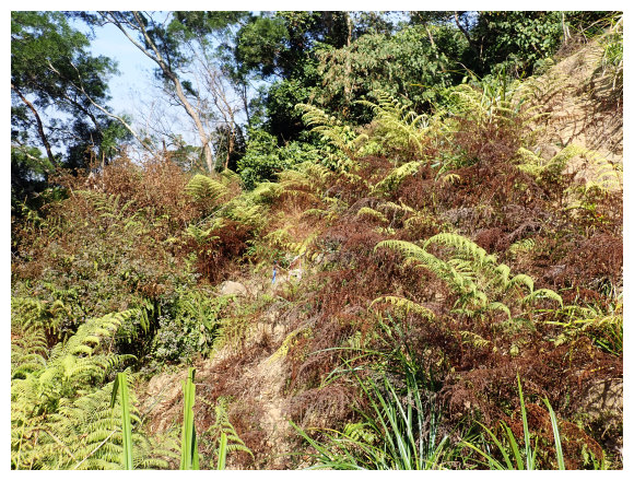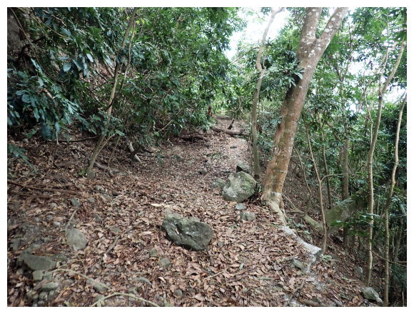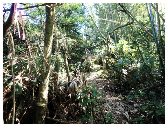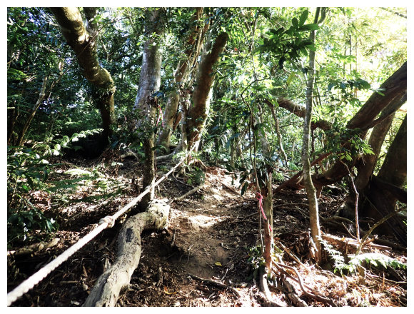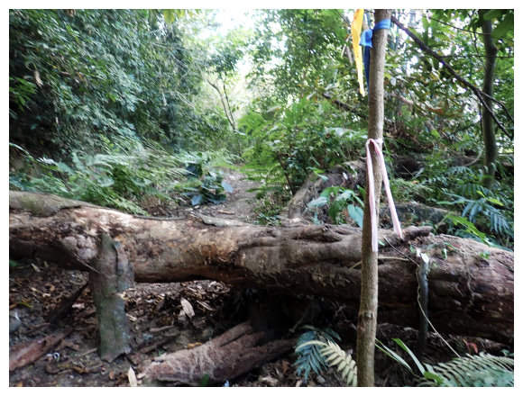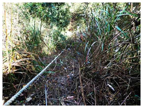09:23 穿越小段田青路段就要離開水泥產業道路左小陡上應綁繩而未綁繩的樹林內陡坡(續行的產業道路很多斷樹不能行)。