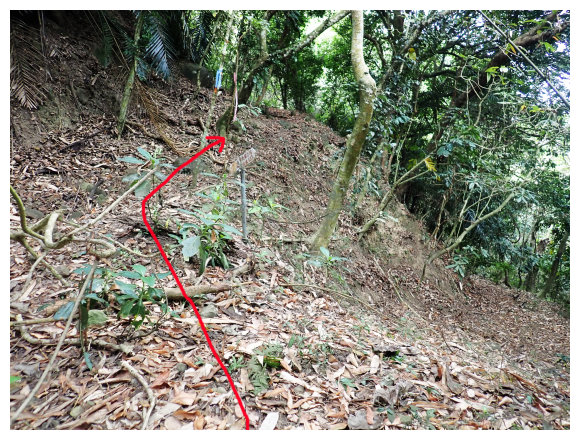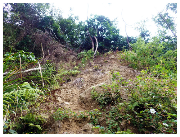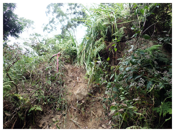 08:48 連續的坍方,順路緩上走即可接回產業道路(不可走陡上的坍路)。